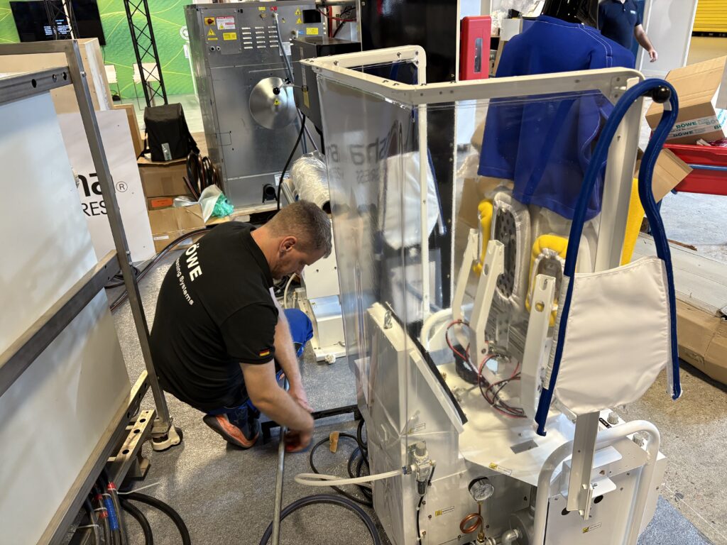 翌日からブース設営のお手伝いを始めた。今回、ブースそのものは小さいがすべてを自分たちで設営するというのだからやることが多い。機械の設置はもちろん、ブースデザインも全てである。機械をライブで見せるのはとても手間がかかる。ご存知の通り、我々は電気とエアー、そして蒸気を使うのでそれぞれの供給元からそれぞれの機械に繋げなければならない。