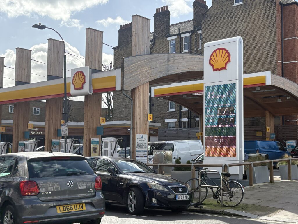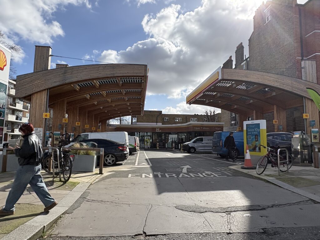 同じように価格も表示されていたが一つは59ペンス、もう一つは73ペンスとあった。ちなみにその価格は1kW(キロワット)ということのようだが、その違いを聞いてみると59ペンスはメンバー価格、73ペンスは一般価格というわけだ。ちなみにJimmyが自宅でチャージするとその費用は13ペンス/kWということなので外でバッテリーチャージすることはとても高いということになる。それでもガソリン価格と比べてみると断然安いそうだ。最近はアメリカおイラン攻撃による世界情勢の緊迫によりガソリン価格は高騰する傾向にあるが、電気は基本的にそのような影響を受けない。しかも、Jimmyの乗っているレクサスの1kmあたりの燃費は4ペンスというので圧倒的に安い。昔、彼はレクサスのハイブリッドに乗っていたことがある。車種はGSだったがその時の燃費は1kmあたり25ペンスだったそうだ。このように考えると経済的観点からも人々がますます電気自動車に傾注していくことは必然のように見える。そのスタンドをよく見てみると併設の店舗内にコーヒーショップなどが設営されている。電気自動車はガソリンと違ってチャージに時間がかかる。その間にコーヒーショップなどで時間を潰すことが出来るような工夫もされている。たまたま通りかかったシェルにはCostaコーヒーが入っていた。このように物理的に電気チャージが出来る場所があることとその時間を紛らすための併設店などが存在する総合的なサービスがあるからこそ人々は安心して電気自動車に移行することが出来るのだろう。